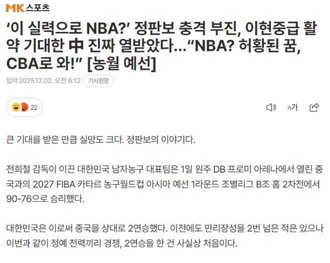 韩媒《MK体育》写道:就这水平还想打NBA?曾凡博世预赛发挥低迷,李贤重的表现出色让中国球迷愤怒,NBA是不切实际的梦想,曾凡博还是回CBA吧。