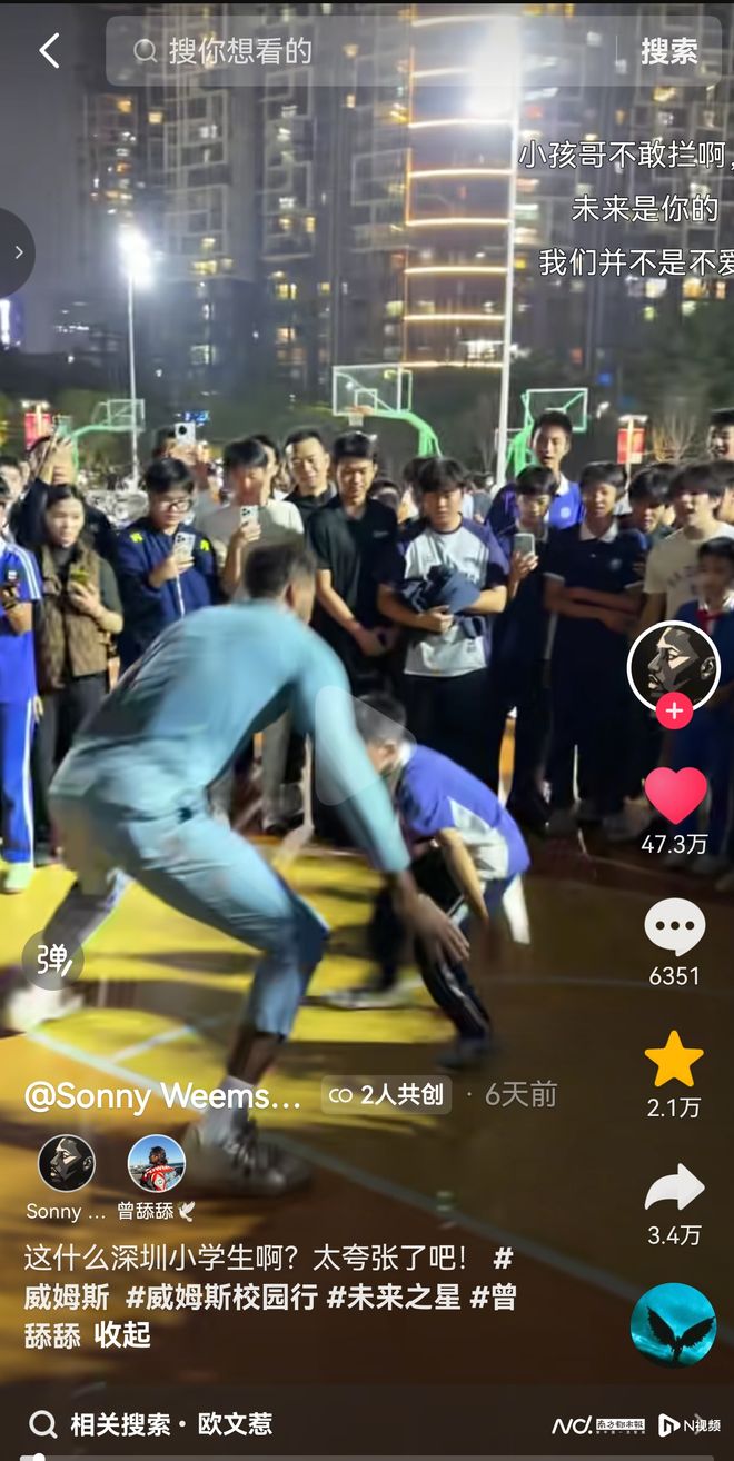 12月5日晚上,蔡梓嘉原本和朋友约了打球,路过宝安体育馆恰巧碰见CBA球星威姆斯、篮球博主曾舔舔被人群围得水泄不通。当曾舔舔喊话“谁想上来单挑?”,他自告奋勇,被朋友们一把推上球场。由于身形瘦小,身旁有位叔叔还担心他会被职业大佬“压扁”。
